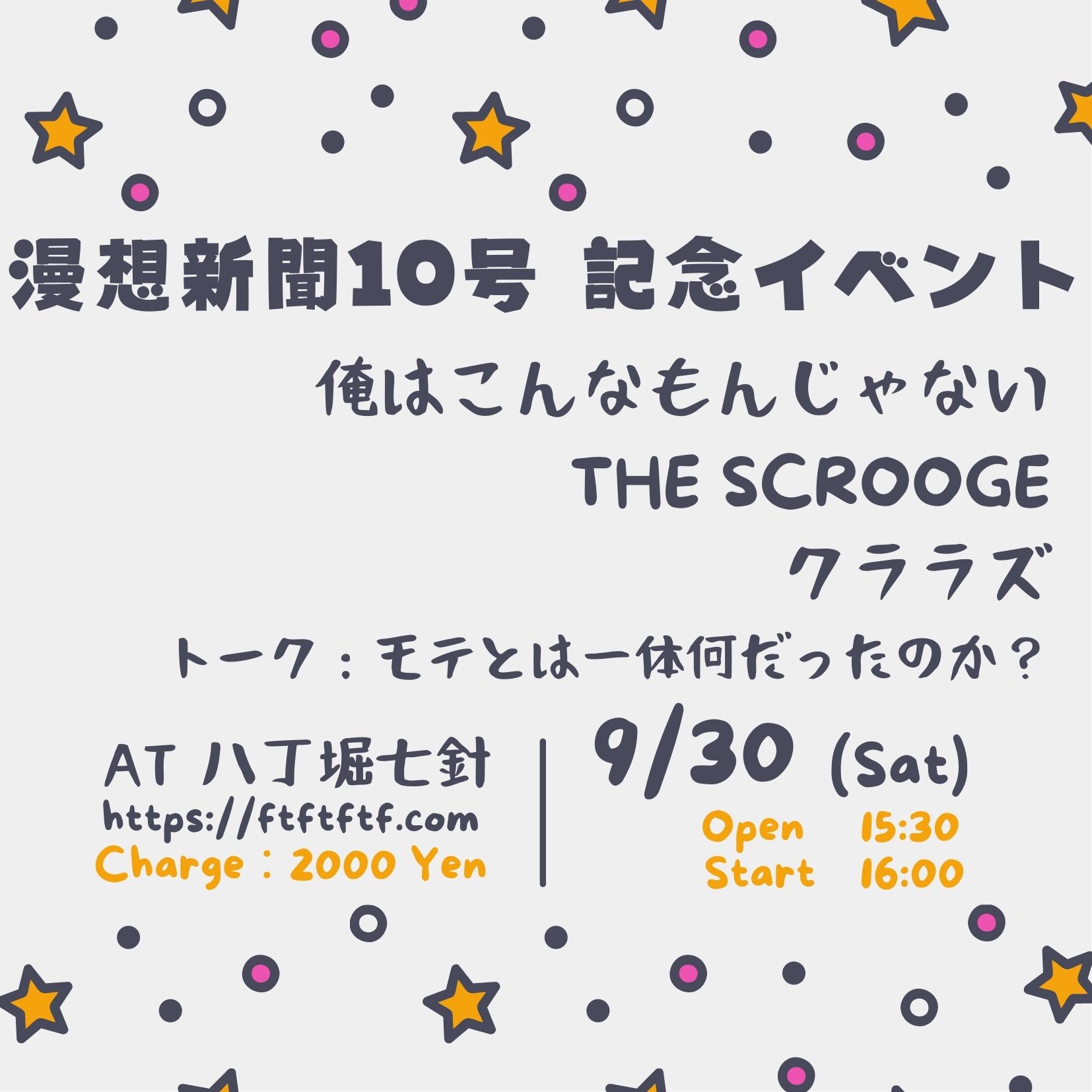 NEWS 漫想新聞10号 記念イベントを開催します! NEWS 2023.08.30 八丁堀七針で10号記念イベントを開催します。バンドの演奏のほか、トークイベントあり、来場者特典ありと盛りだくさんなので、ぜひ遊びにきてください。本サイトでも予約を承ります! 漫想新聞10号記念イベント!!9/30(土) 七針15時半オープン 16時スタート2000円演奏:俺はこんなもんじゃない/The Scrooge/クララズトーク:「モテとは一体何だったのか?」トークゲスト:クララ、M谷A子ほか